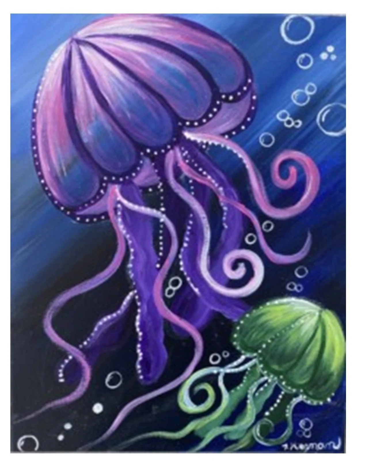 Time to bring out your flippers and snorkels and go deep in the sea! We will be painting a vibrant jellyfish under the sea on an 11X14 canvas board. This class will give instruction on working with acrylic paints with blending techniques to create a translucent looking jellyfish that will look like you could reach out and grab it in the water!