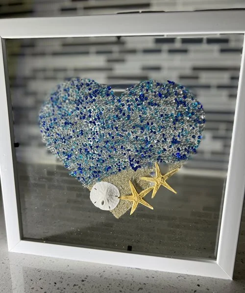 Students will leave with: A wall hanging covered with sea glass, sand, starfish, and sand dollars.