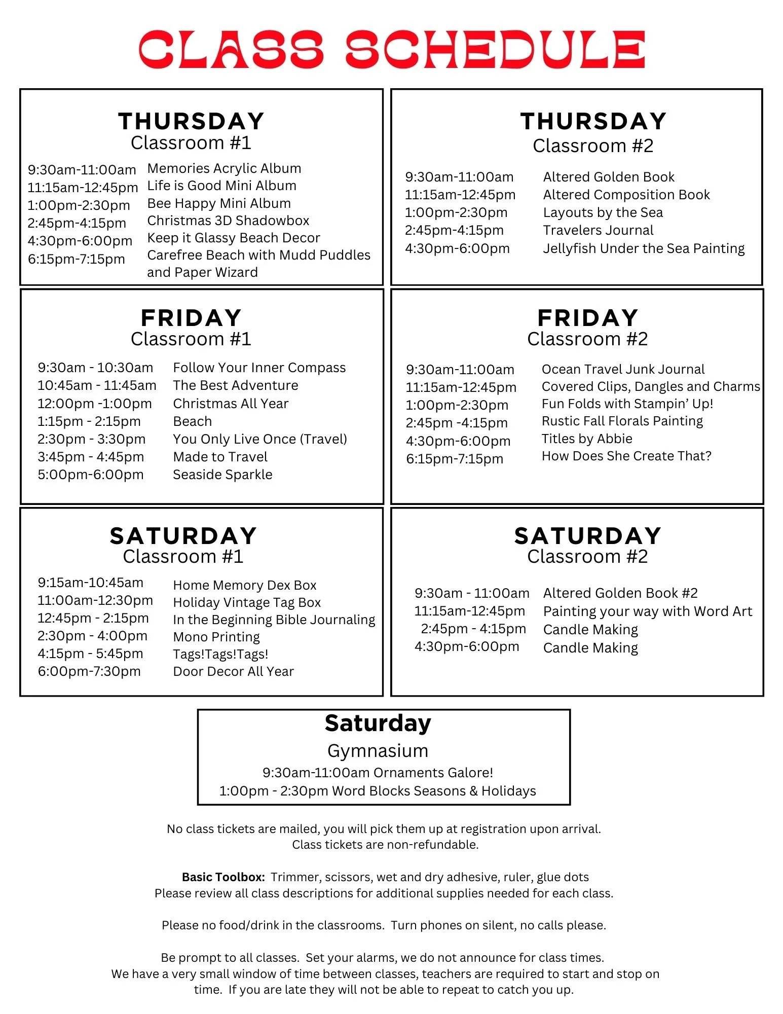 Please read and save the supplies needed list for each class as they are required to attend class.